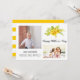 Este Dia de as mães moderno mostra duas de suas fotos favoritas da família, um monte de flores amarelas da aquarela e a frase "Dia de as mães Feliz" em preto em escrita cursiva. Seus nomes estão escritos em preto numa fonte moderna. O dorso está coberto com um padrão listrado amarelo e branco. Uma foto é de Fotografia © Storytree Studios, Stanford, CA