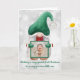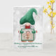 Um belo cartão de Natal com uma foto e um gnomo de aquarela com um chapéu verde. Na dentro do cartão está uma mensagem de Natal