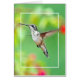 Um beija-flor fotografado no ar do médio com flores de focagem suave como fundo.