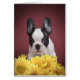Frenchie - cachorrinho francês com flores amarelas em fundo vermelho