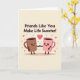 This greeting card shows two cute mugs in the center, holding hands like close friends. One mug is a deep mocha brown and the other is a soft pink, and both have round black eyes, rosy cheeks, and big happy smiles. Their little arms are thin and black, reaching toward each other to show warmth and connection. The background is a light creamy pastel, with small pink hearts and tiny star shapes floating around them for a sweet, loving feel ❤️. At the top, the card says “Friends Like You Make Life Sweeter!” in dark brown block letters that stand out clearly. Gentle shading and small shadows under the mugs give the picture a bit of depth without making it busy 💌🍫.