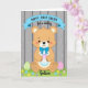 This card features a friendly cartoon bear in warm tan and brown, seated front and center with rounded paws holding a softly glowing pastel egg, as if offering it with quiet affection 🌷. A sky-blue bow tie sits at its neck, matching a light blue banner that curves across the top of the design. On the banner, a short Easter greeting appears in a slender, flowing letter style, set in a darker blue so it stands out clearly. The bear’s rosy cheeks and wide, gentle eyes give it a tender, companionable look, like it’s sharing the moment with someone close 🐇. Behind the character, a textured gray wooden fence stretches across the background, adding a cozy, rustic setting. Along the bottom edge, bright green grass is sprinkled with small flowers in yellow, blue, and pink, and two patterned eggs in soft green and pink peek out from the lawn. The scene uses soft outlines and smooth pastel shading, with the blue banner arcing above the bear and the decorated eggs nestled low in the grass.