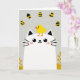 This card shows a minimalist scene on a soft grey background, with a rounded white cat-like creature resting across the lower half of the front. Its big dark eyes, tiny whiskers, and a faint pink blush on the cheeks give it a tender, friendly look, as if waiting for a close friend to lean in. Sitting on top of its head is a small yellow bird with dot eyes, an orange beak, and tiny orange feet, perched with easy trust like a sweet little date 🐇. Across the upper area, five egg-shaped decorations drift in a loose scatter, bringing a gentle spring mood 🌷. Each egg is bright yellow with black stripes and zigzag accents, standing out sharply against the muted background. Near the bottom corners, small sprays of yellow leaves peek inward to frame the pair without crowding them. A short greeting in black text sits near the top center, floating above the eggs.