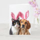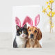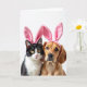 This card shows a close-up portrait of two cozy household companions—a black-and-white cat and a golden-brown dog—posed side by side against a bright white background. They wear plush pink bunny ear headbands 🐰, and the soft fabric folds sit high on their heads like a shared costume for two close friends. The cat’s yellow eyes meet yours with a calm, slightly bashful look, set above a small pink nose and long white whiskers. The dog’s dark eyes lean toward the cat with a tender, protective gaze, its warm coat catching the gentle light. The lighting stays even and soft, bringing out fine fur texture and the smooth sheen of the pink ears without harsh shadows. Near the top, a short Easter greeting appears in light pink lettering, centered above their heads, with a smaller line in gray placed just below it. The oversized pink ears arch upward like rounded petals 🌷 against the white space.