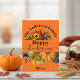Este cartão de Ação de Graças personalizável apresenta um fundo laranja vibrante destacando duas ricas cenas de colheita. A borda superior exibe girassóis e folhagens de outono emoldurando o nome da sua família. A parte inferior apresenta uma abóbora laranja, uvas roxas e maçãs verdes. A frase "Feliz Dia de Ação de Graças" é elegantemente escrita no meio, tornando este um cumprimento de outono ousado e lindo.