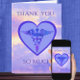 Cartões de agradecimentos para médicos, enfermeiros ou outros prestadores de cuidados médicos. Um caduceus colorido, a insígnia oficial do Corpo Médico dos Estados Unidos, é enquadrado dentro de um coração azul de duas tonalidades. O fundo é um céu incrível com raios de sol a passar por nuvens. Muito obrigado, está na frente do cartão. A saudação dentro diz: Se o mundo tivesse mais pessoas como você, seria um lugar melhor. A família (nome da sua família) é grata e apreciadora por todos os seus esforços e atos de gentileza.