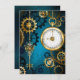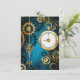 Turquesa, texturizada, fundo steampunk com latão e engrenagens douradas, chave prateada e relógio. Estilo Steampunk.