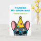 Se você conhece alguém que ama buldocos franceses e tem um bom senso de humor, este engraçado cartão de aniversário francês é ideal para enviá-los no seu dia especial. A design apresenta uma ilustração ao estilo cartoon de um buldogue francês, azul e de cor castanha, vestindo um chapéu de festa e óculos de sol com a menção "Perdão, meu frango! Você tem quantos anos?" escrito na frente. Este design também está disponível com diferentes Bulls franceses de cor diferente.