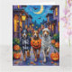 Cães de Gado Australianos Adoráveis vestidos com fantasias lúcidas de Halloween carregar baldes de abóbora enquanto trick-or-tratando sob o céu iluminado. Este design festivo destaca a casaco, os olhos inteligentes e o espírito enérgico da raça, capturando perfeitamente a atmosfera assustadora e divertida da noite de Halloween. Uma comemoração viva para amantes de cães e fãs de Halloween.