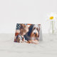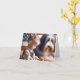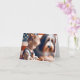 Menina bonita com rabo loiro e mãos dobradas em oração com cartão de vazio de cão collie com barba
