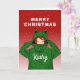 Garota bonita com capuz Sapo verde desenhando cartão de Natal. Um belo desenho de uma garota vestindo um capuz de sapo verde e um nome personalizado. O fundo é vermelho gradiente. Divertido, design de férias com flocos de neve para uma garota. Adicione seu nome e texto.