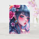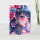 Cartão de aniversário de uma garota bonito com dentro. Linda garota com olhos azuis e cabelo azul cercado por flores rosa e azuis. Bonito floral e anime com tema arte digital ai.