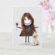 Menina bonitinha em tênis, vestido de bolinhas, colar de pérolas com uma taça de vinho tinto, e cão de recuperação de ouros em um fundo de terrazzo de cinza mole para aniversário.