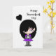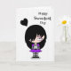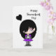 Menina de emo bonita com cabelo preto e vestido roxo para o cartão de Dia Mais Bonito. O coração negro no ar contribui para a design de tendências. Design © 2015 Julia Bryant.