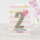 Um cartão cor-de-rosa e segundo aniversário dourado, que você pode personalizar com o nome dela. A frente dessa bela placa de segundo aniversário para ela apresenta o número dois em uma faixa preta e branca com um contorno de brilho com um balão rosa pronto para flutuar. Por favor, note que o brilho dourado é um efeito de design e não haverá nenhum brilho real neste cartão de aniversário. O fundo é branco suave e cor-de-rosa com um banner de bunting ouro suave no topo.A mensagem dentro pode ser facilmente personalizada se você quiser. Um cartão de segundo aniversário bonito para ela.