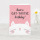 Cartão de aniversário bonito com um gatinho branco esbranquiçado contra um fundo cor-de-rosa espalhado por um confete branco. Ter um aniversário de gato-tastic é escrito em fontes encantadoras.