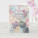 Cartão de aniversário para a neta com um gatinho doce a cheirar um buquê de flores, cercado por uma colagem de outros elementos florais e aquarela e marcas brancas de tinta.