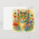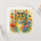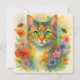 Um doce cartão de aquarela com um gato com olhos verdes brilhantes, cercado por flores e abelhas coloridas. Perfeito para qualquer ocasião - para dizer olá, para o obrigado, ou apenas para iluminar o dia de alguém.