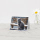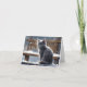 Doce gatinho cinza aproveitando a neve que cai. Em branco por dentro para sua mensagem pessoal. Perfeito para desejos de aniversário, feriados, cartões de agradecimento, etc.