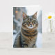 Um gato de rua de mesa se senta ao ar livre em uma cidade em meio a uma queda suave de neve criando uma cena serena de inverno. O texto pode ser alterado.