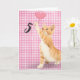 Dourado gato com balão de coração cor-de-rosa para 5 de aniversário em fundo de gingham rosa e branco.