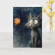 Um gato preto esfregado com olhos esfregados e esfaqueados esfregando-se num solteiro que cai numa folha de outono laranja. Todo o texto pode ser alterado.