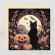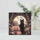 Aqui está um cartão legal de Halloween com um gato preto e jack-o'-lantern. O design é em cores de outono com folhas laranja e pretas e morcegos. É um ótimo cartão de Halloween e é perfeito para saudações da temporada assustadora, convites ou para acompanhar um presente.