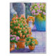 Um gato laranja espiando por trás de flores cercadas em um pátio. Visite Cat-Paintings.com para ver mais gengibre gengibre.