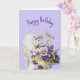 Gato persa branco e buquê pansado roxo em uma cesta antiquada em fundo de bolinhas para um aniversário. O texto pode ser editado ou excluído.