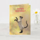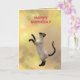 Um gato siamês bonitinho nas pernas traseiras brincando com uma mensagem de aniversário.