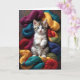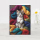 Lindo gato tabby cinza e branco com olhos azuis se acomodou entre fios coloridos de lã neste cartão de saudação em branco.