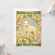 A sweet lamb stands in a grassy meadow, framed by a floral wreath and pastel Easter eggs. This vintage-style card evokes peace and joy, making it a lovely way to share Easter blessings with loved ones.