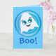 Um divertimento e um fantasma adorável do Dia das Bruxas com um fundo azul e uns olhos azuis brilhantes.