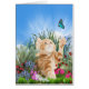 Um gatinho de gengibre entre muitas flores tocando no final do verão indo para a primavera perseguição com borboleta azul