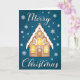 Um cartão de cartões de natal com uma bela ilustração da casa do pão de gengibre junto com as palavras Feliz Natal na frente com uma mensagem personalizável no dentro.