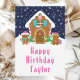 Este cartão de aniversário fofo e festivo pode ser personalizado com um nome ou título como filha, neta, sobrinha, amiga, etc. A design apresenta uma bela casa de pão de gengibre decorada com doce de Natal rosa e verde. Além disso, são adoráveis gengibres com presentes, vestidos com chapéus de Papai Noel e cachecol. Ao fundo está um céu azul marinho de inverno com flocos de neve em queda elegante. O texto é corajoso e festivo. Isto é perfeito para o Natal e o feriado de inverno.