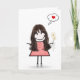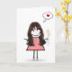 Bonita bonitinha de cabelo escuro longo, vestido de gingham, colar de pérolas, tênis, e segurando uma buquê de margarida para pensar em você. O fundo branco pode ser alterado. O texto é editável.