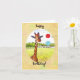 Uma girafa segurando um balão de festa vermelho e azul. Esta girafa divertida tem um fundo de um campo de grama verde-clara e pequenas árvores verdes. A frente lê Parabéns! É um cartão de excelente para crianças de todas as idades. O Dentro diz que você é a vida de cada festa!