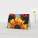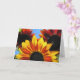Este cartão de nota é cheio de brilho e alegria! Três girassóis brilhantemente coloridos são iluminados pela luz solar que flui através das pétalas. As flores exibem uma bela paleta de ouro, amarelo, laranja, vermelho e marrom. Folhas verdes e céu azul completam essa composição de cor e forma.