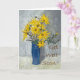 Um cartão 'fique logo' com um vaso azul de girassóis ouros, de uma pintura original a pastel de óleo de Judy Adamson. dentro de vazio para sua própria mensagem. Veja também cartões de aniversário e de obrigado com este design.