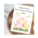 This 2nd birthday card is suitable for a granddaughter or daughter. The design includes watercolour grass, stars, a pink dinosaur with birthday balloon and yellow dinosaur with birthday gift.