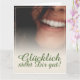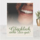 Glücklich, Dir, instinto! Kompliment Karte mit lachendem Frauengesicht und handschriftlichen Grüßen auf der Vorderseite der Karte. Restliche Flächen stehen zur freien Verfügung.