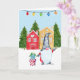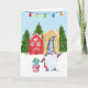 Este cartão de férias é decorado com um gnomo parado ao lado de uma torre de presentes em frente a casas bonitinhas e a um fundo de neve.