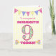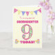 Um bonito cartão de 9 de aniversário para a sua afilhada, com bolinhas, flores de primata e números cheios de um padrão primata, tudo num fundo amarelo pálido de gingham. A mensagem principal do cobrir é: "Para uma FILHA MUITO ESPECÍFICA 9 HOJE!" A mensagem dentro é apenas uma sugestão e você pode personalizá-la facilmente ou excluí-la se preferir.