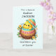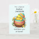 Torne a Páscoa mais significativa para seu afilhado com um cartão personalizado criado apenas para ele! Um pintinho precioso eclode de seu ovo, cercado por flores vibrantes de primavera, simbolizando a alegria da estação. O nome dele na frente faz deste cartão uma espécie de guardiã, contra um fundo pastel macio. Uma maneira sincera de celebrar a Páscoa com amor e fé!