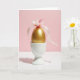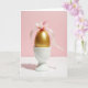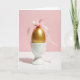 Designed with a gleaming golden egg shape resting in a white ceramic egg cup, this card front feels like a small shared treasure between two people. Soft light glides across the metallic surface, giving it a gentle glow that reads like a quiet romantic wink. A feathery tuft in white and blush pink sits on top, and a narrow ribbon wraps around the egg as if it were being lovingly presented. Tiny pale-pink decorative lettering trails along the ribbon, and a simple greeting appears near the upper area in light pink, leaving plenty of open space around it 🌷. The background is split into two calm fields, with pastel pink across the top half and bright white below, creating a sweet, airy setting. High-key lighting keeps the scene light and tender, and the cup’s base casts a soft, diffused shadow that drifts to one side. A small hint of blush pink in the feather and ribbon stands out against the pink-and-white backdrop, with the golden egg centered above the cup and the shadow stretching across the white surface 🐰.