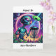 Cartão de aniversário com um tema de disco e alienígena. Uma alienígena extraterrestre num planeta a jogar golfe em disco. Dentro de jogo de golfe.