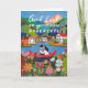 Charming illustrated greeting card featuring a romantic couple in a boat surrounded by colorful flowers, mountains, and a peaceful village landscape. Perfect for wishing someone good luck on a new adventure, move, marriage, life journey, or exciting new chapter. Original artwork by Caroline Bonne Müller