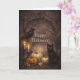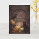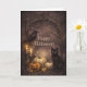 A moody, gothic-inspired Halloween illustration bathed in candlelight and shadow. An ornate, antique archway frames a quiet nocturnal scene where a sleek black cat gazes forward with luminous eyes, a watchful raven perches above, and carved pumpkins glow softly at their feet. Flickering candles, bare tree branches, and drifting sparks of light add an air of mystery, while the elegant “Happy Halloween” lettering floats against a dark, velvety background.