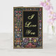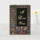 Arte gótica vinda de um manuscrito iluminado antigo com flores coloridas e folhas rolantes sobre fundo preto. Combinei a Idade Média e Moderna para criar um cartão que você pode personalizar com seu próprio texto de saudação e escolha de estilos de inscrição na frente e no dentro.